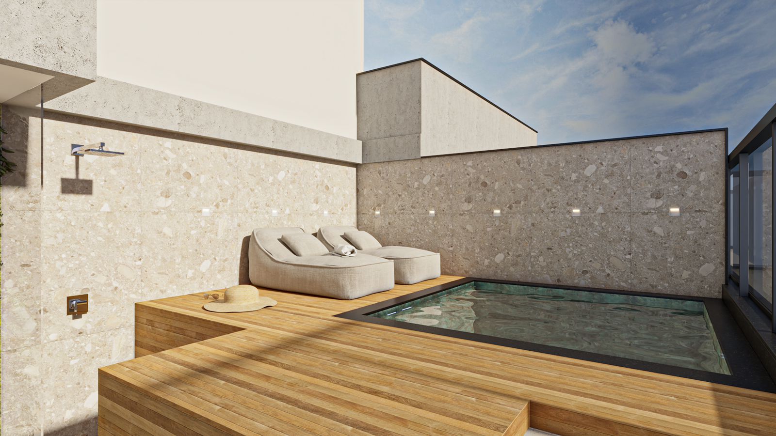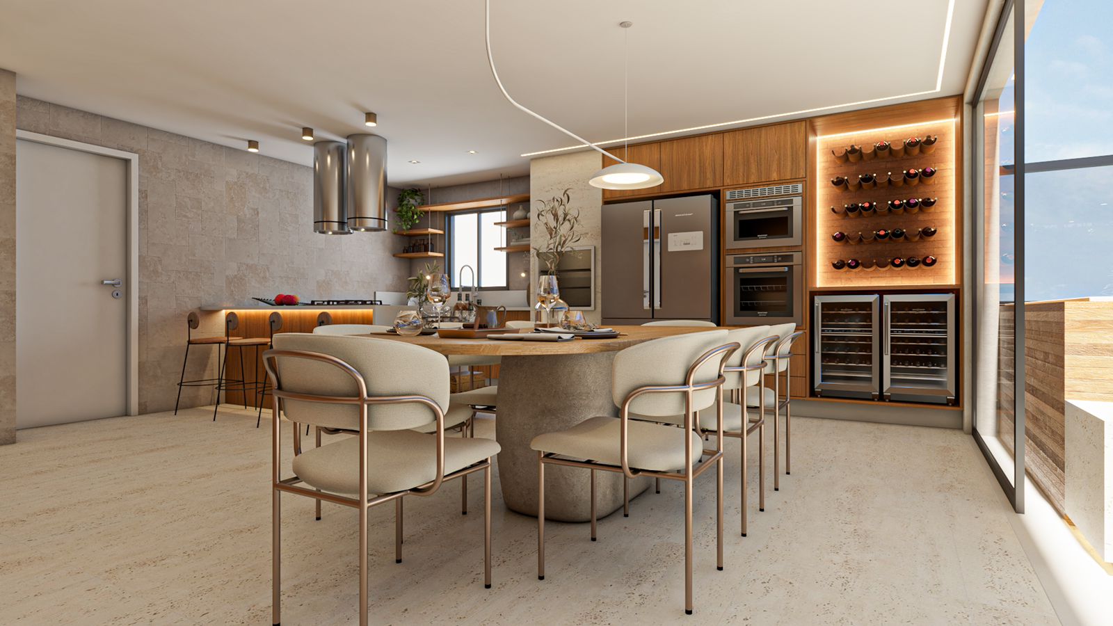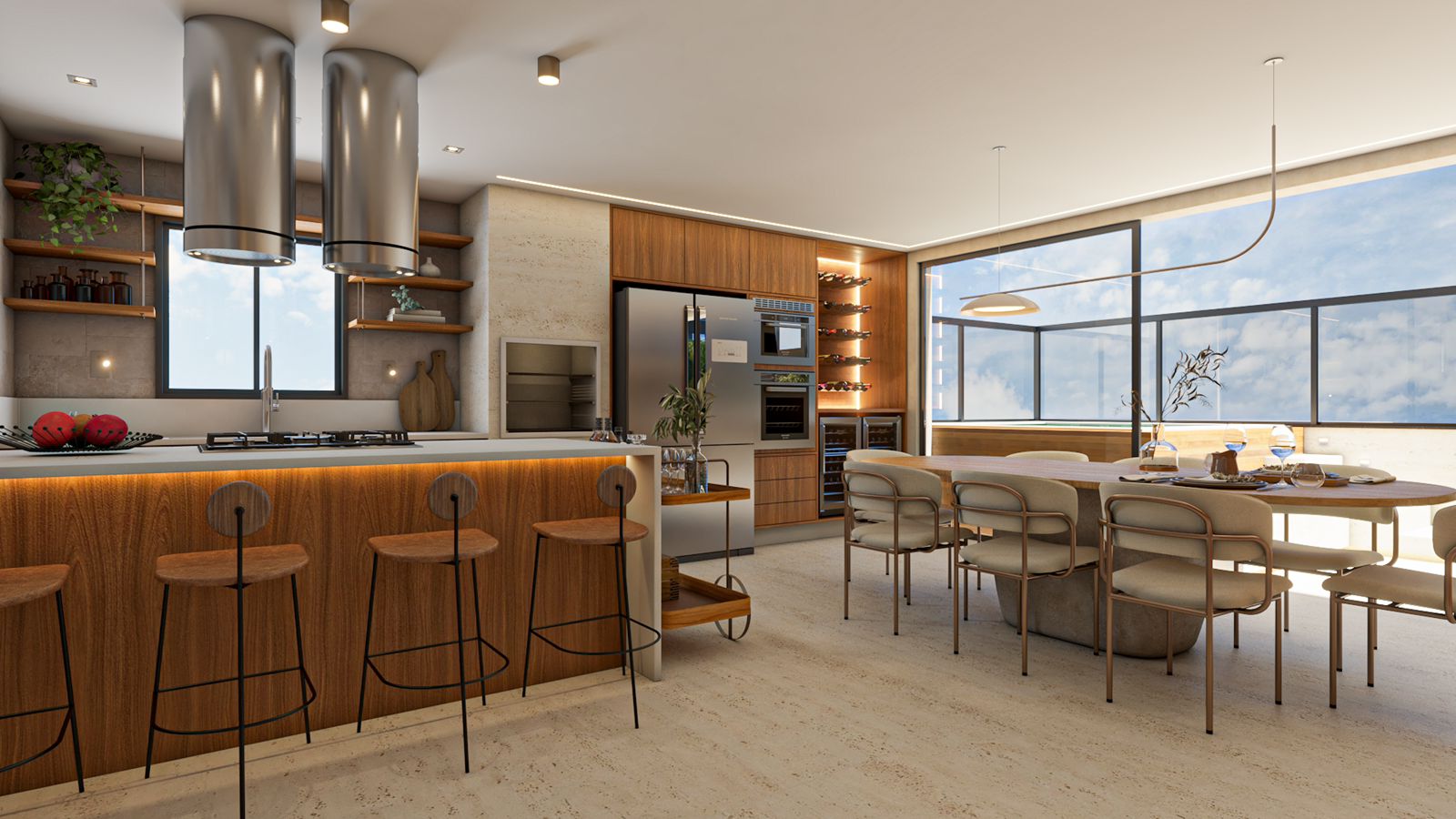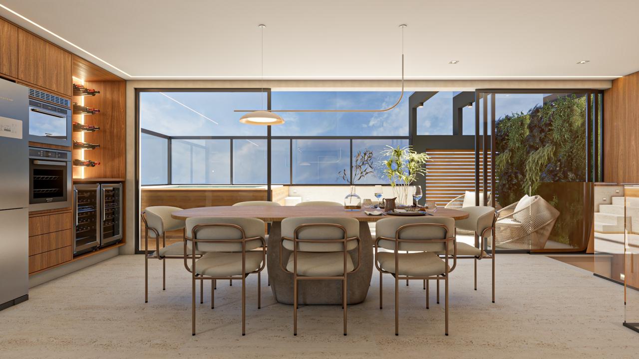 Área de lazer privativa com piscina, churrasqueira e cozinha com ilha e mesa de jantar embutida