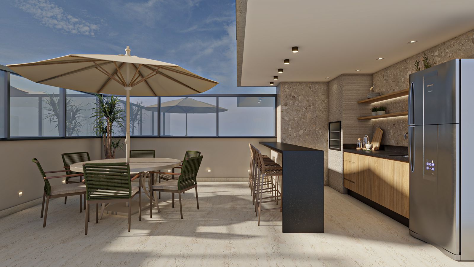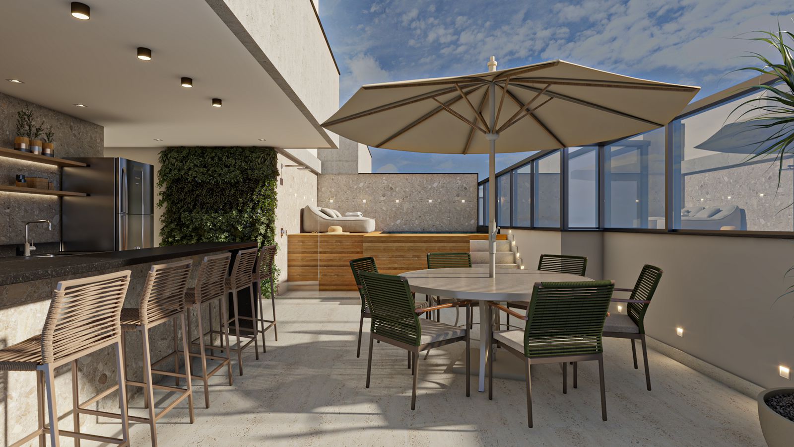 Excelente área de lazer com ambientes planejados para descanso e convivência
